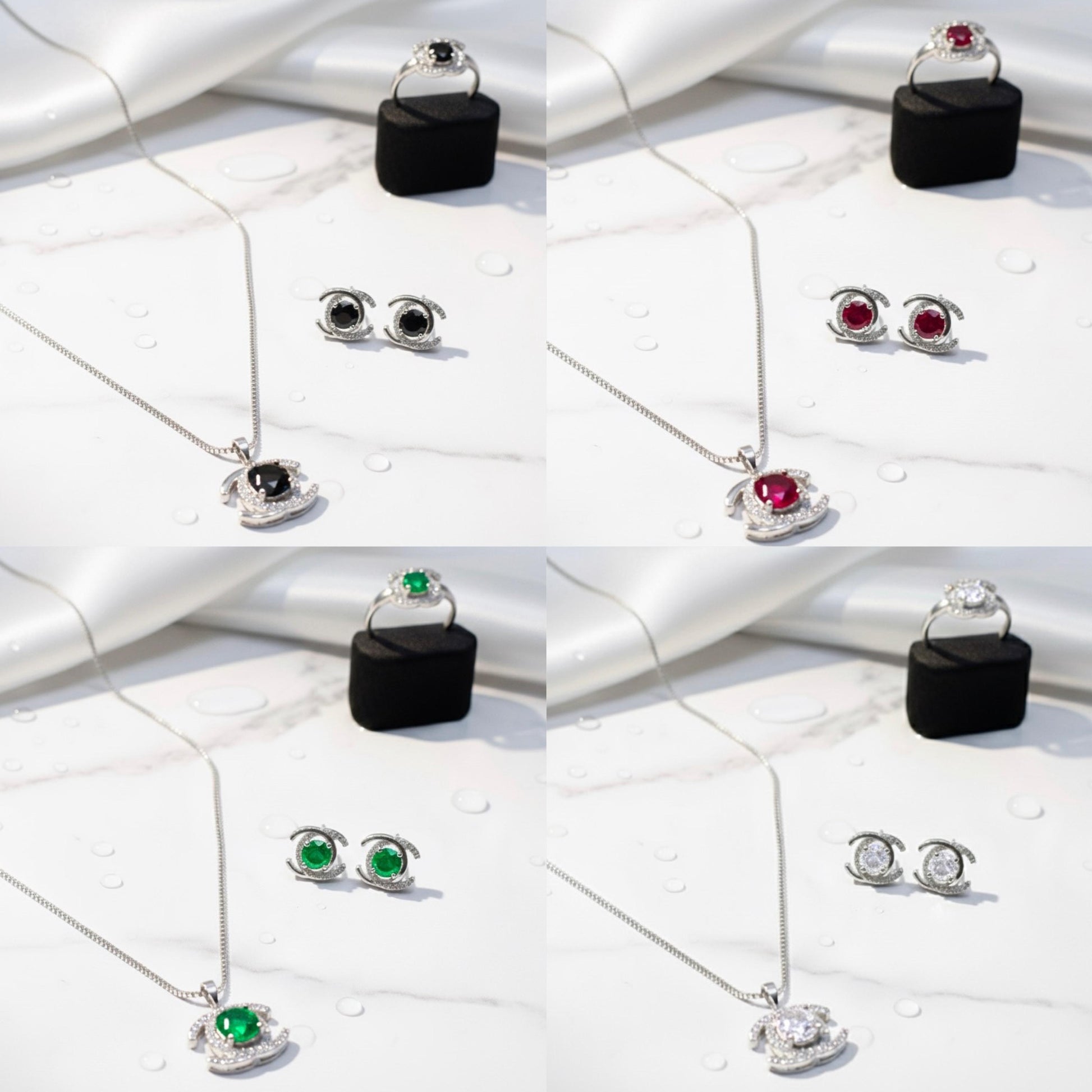 This stunning jewelry set features a deep sapphire gemstone centerpiece surrounded by sparkling crystal accents, set in a sleek silver-tone finish. The set includes a delicate pendant necklace, a pair of elegant stud earrings, and a matching statement ring. The classic design paired with the rich blue stones adds a touch of timeless sophistication, making it perfect for formal events, evening wear, or as a luxurious gift